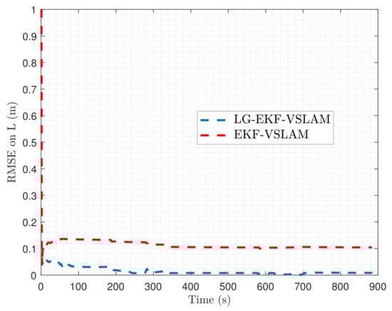 The problem of filtering on LGs has recieved a lot of attention in recent years, particularly in applications such as visual navigation and robotics to estimate the rotation and transformation matrices of a rigid body [,]. The interest of the LG framework is to overcome a complex Euclidean parametrization (as Euler angles or quaternions) by using a unified and elegant formalism, taking into account the geometric properties of these matrices. Consequently, the LG structure of the state vector admits advantages, compared to the classical VSLAM extended Kalman filter (EKF-VSLAM):