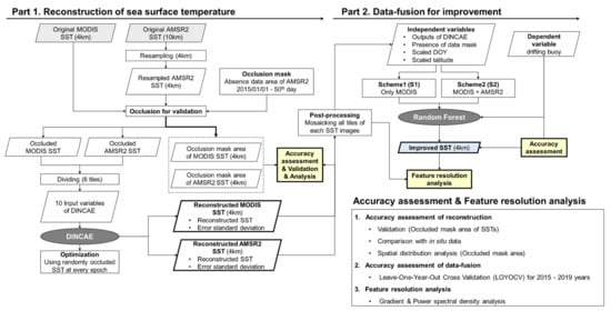 Figure 3 shows a framework of the proposed approach to generate high-quality, high-resolution seamless daily SST from two satellite sensor data. The proposed approach consists of two parts: (1) reconstruction of MODIS and AMSR2 SSTs based on DINCAE and (2) improvement of the reconstructed SST through data fusion based on RF machine learning using in situ measurements. Two parts were described in the following sections in details.