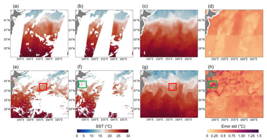 As shown in Figure 5 and Figure 6, the error standard deviation of AMSR2 SST was low (<1 °C) over the study area including the areas with missing data. Similar to other accuracy metrics, the difference in the error standard deviation by latitude was also dominant in the reconstructed AMSR2 SST (Figure 5f and Figure 6f). OI-based DINCAE generally yielded relatively low errors for areas where data exist similar to the results of AMSR2 (Figure 5f and Figure 6f). On the other hand, the error standard deviation of the reconstructed MODIS SST varied by tile and the difference by latitude was not great. Some areas at high latitude (tiles 1–3) where original SST data exist yielded the high error standard deviation for the reconstructed MODIS SST (green boxes in Figure 5f,h; Figure 6f,h). The scaled error probability density function of MODIS was positively skewed, while that of AMSR2 followed the normal distribution (Figure S3), which made the MODIS reconstruction slightly less performed than the AMSR2 one. In addition, both AMSR2 and MODIS results showed high error standard deviation in the coastal region of Japan regardless of the presence of data, which was similar to the spatial distribution of RMSE (Figure 4c,d). These results imply that areas with low reconstruction accuracy had large uncertainty in the estimation of reliable error standard deviation. Such an uncertainty has been reported in the previous studies that applied OI for EOF [13].