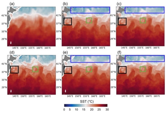 Figure 8 depicts the spatial distribution of the reconstructed SSTs, SSTs improved through data fusion by scheme using bias-corrected satellite-SSTs (i.e., MODIS and AMSR2 SSTs, see Section 2.2), and high-resolution operational SST products. As shown in Figure 4a and Figure S3a, the reconstructed MODIS SST (Figure 8b) tends to be underestimated at high latitude (i.e., blue boxes in Figure 8b,c,e,f) when compared to other products. One possible reason is that the image resizing method (i.e., nearest neighbor) in the decoder layer for dimension restoration induces smoothness during the reconstruction [35]. Surprisingly, scheme 1 (Figure 8d) and scheme 2 (Figure 8e) effectively mitigated such underestimation in the reconstructed MODIS SST (Figure 8b). In particular, scheme 1 (Figure 8d) seemed to focus on a specific range of temperature when compared to the reconstructed MODIS SST (Figure 8b). For example, the scheme 1 result (Figure 8d) clearly showed the core ring of a warm eddy (i.e., black boxes on Figure 8), similar to the operational products (OSTIA in Figure 8c and MUR SST in Figure 8f). However, based on visual interpretation, the overall spatial distribution of scheme 2 SST was in better agreement with the operational products than that of scheme 1 SST, which corresponded to the accuracy assessment results in Table S3.