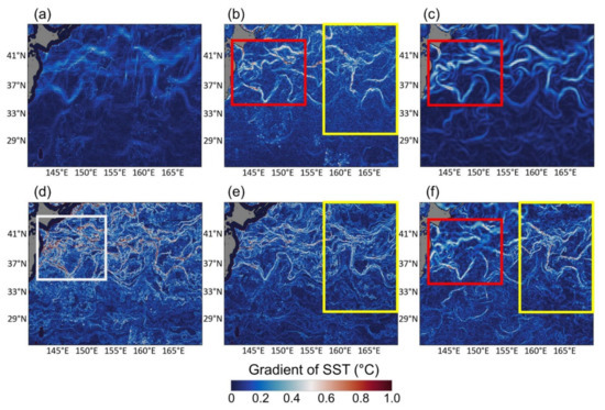 Spatial distribution of SST gradient fields on 6 November 2018: (a) the reconstructed AMSR2 SST, (b) the reconstructed MODIS SST, (c) OSTIA SST, (d) scheme 1-improved SST, (e) scheme 2-improved SST, and (f) multiscale ultra-high-resolution (MUR) SST. The spatial resolutions of the SST data are 10, 4, 4, and 4 km and 0.05° and 0.01°, respectively.