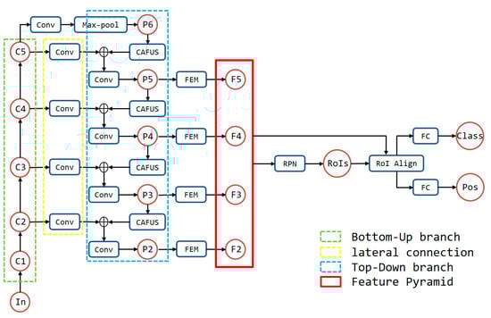 After obtaining the feature map sets, we generate proposals using RPN and fix the proposals into unique scales using RoI Align. We use two fully connected layer branches to compute the category scores and location regression parameters of the modified proposals to finally complete the classification and localization of the targets. To reduce the complexity of training, an adaptive mapping of the generated proposals onto feature maps is performed to calculate the training losses and adjust the network parameters according to the scales of the labeled boxes. The structure of the network proposed in this paper is shown in Figure 2.