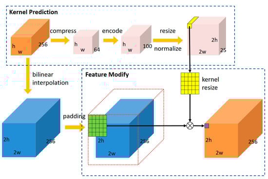Content-Aware ReAssembly of Features (CARAFE) [37] is a learnable image up-sampling algorithm based on the input content, which divides the feature map up-sampling into two parts, i.e., up-sampling kernel prediction and feature reassembly. Experiments show that CARAFE has a large perceptual field, and the model is light enough to retain the feature information of the input better. CARAFE will also enhance the feature semantics to an extent. In this paper, we design a new image up-sampling algorithm, named Content-Aware Feature Up-Sampling, as shown in Figure 3.