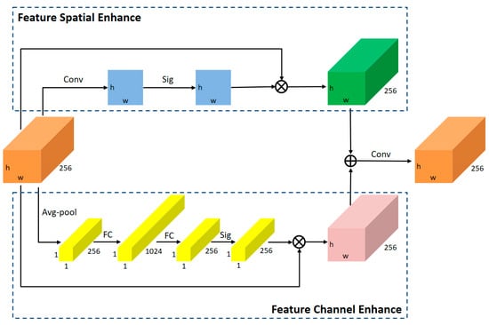 Details of the Feature Enhance Module. Feature spatial enhance (FSE) fuses multi-channel information using a 1 × 1 convolution kernel and normalizes it using a sigmoid function to obtain two-dimensional spatial weights. Feature channel enhance (FCE) obtains a 1 × 256 vector using global average pooling. Then, the vector is calculated by two fully connected layers and normalized using the sigmoid function to obtain the one-dimensional channel weights. Enhanced features from the two approaches are superimposed together, followed by further fusion of the local feature information using 3 × 3 convolution.