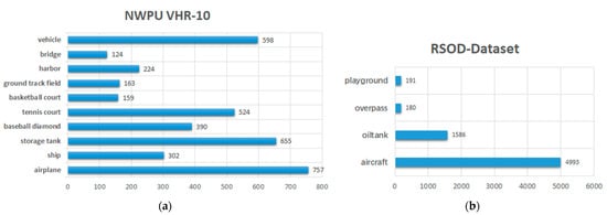 NWPU VHR-10 contains 800 high-resolution satellite images cropped from the Google Earth and Vaihingen datasets and then manually annotated by NWPU experts. Among them, 650 images carry labeled targets, with a total of 10 categories and 3896 instances. RSOD-Dataset was labeled by a team from Wuhan University, and the dataset contains 976 images divided into four categories with a total of 6950 instances (4993 instances belong to the category of “aircraft”, accounting for 71.8%).