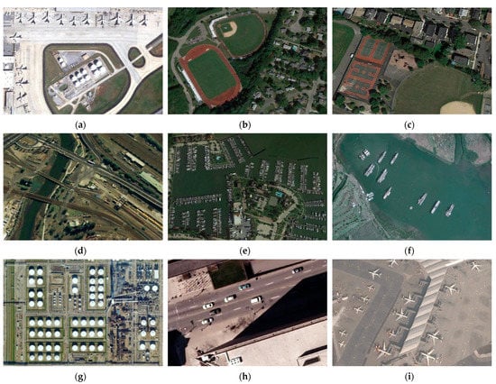 As deep neural networks become the dominant algorithm for remote sensing image processing, the demand for remote sensing images is increasing, and therefore many teams have open-sourced remote sensing image datasets for use by other scholars. Among them, some typical remote sensing image datasets include DOTA (a large-scale Dataset for Object deTection in Aerial images) [38], UCAS-AOD (UCAS-High Resolution Aerial Object Detection Dataset) [39], NWPU VHR-10 (NWPU very-high resolution optical remote sensing images with 10 categories) [1,21,40], RSOD-Dataset (Remote sensing object detection) [41,42], the INRIA Aerial Image Labeling Dataset [43] and the TGRS-HRRSD-Dataset [44].