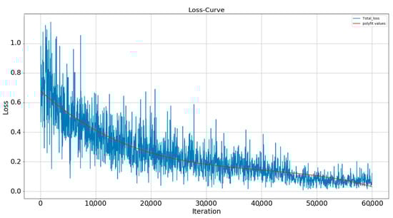 During the training process, the loss values generated by Multi-stage FEPN were recorded every 10 iterations during the training process, and the loss curves were plotted as shown in Figure 7. To more clearly represent the direction of change of the loss during the training process, we fitted the data using the least squares method, which is represented by the red curve in Figure 7. From the loss curve, it can be seen that the loss decreases gradually during the training process of the network, with the loss decreasing faster at the beginning of the training and then slower, which is in line with our expected results. Finally, the loss of the network is essentially stable around 0.1, indicating that the training process of Multi-stage FEPN is stable.