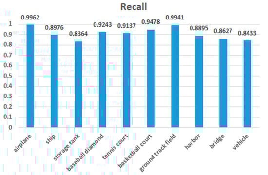 Figure 8 shows the recall rate for each category of targets in the NWPU VHR-10 dataset. The results show that Multi-stage FEPN has a high recall rate for most targets, but the recall rates for storage tanks and vehicles are relatively low, only 0.8364 and 0.8433.