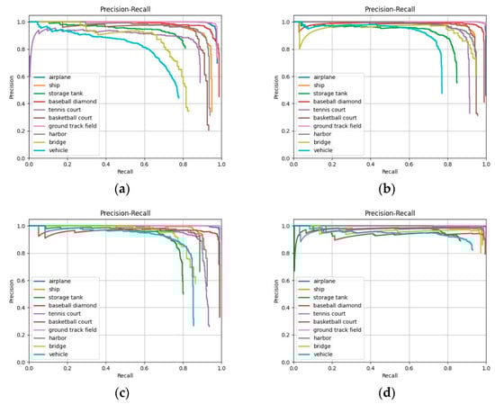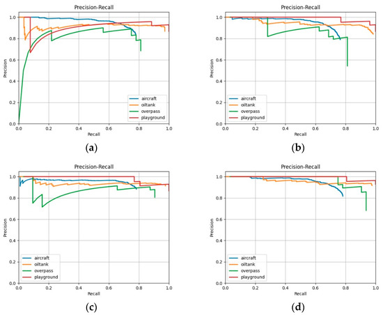 The P-R curves of different frameworks on RSOD-Dataset. (a) Def. R-FCN; (b) RICADet; (c) Multi-Scale CNN; (d) Multi-stage FEPN.