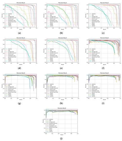 The P-R curves of different frameworks with the NWPU VHR-10 dataset. (a) Faster-RCNN; (b) YOLO; (c) SSD; (d) RICNN; (e) R-P-Faster-RCNN; (f) Def. R-FCN; (g) Def. Faster-RCNN; (h) RICADet; (i) Multi-Scale CNN; (j) Multi-stage FEPN.