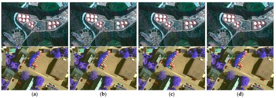 The detection results of different networks for vehicles and storage tanks. (a) Multi-stage FEPN; (b) Def. Faster-RCNN; (c) RICADet; (d) Multi-Scale CNN.