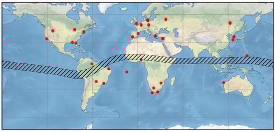 A map of the areas around Digisonde sites corresponding to a radius of 170 km used to calculate occurrence rates from GPS-RO measurements. The shadowed region corresponds to of geomagnetic latitude.