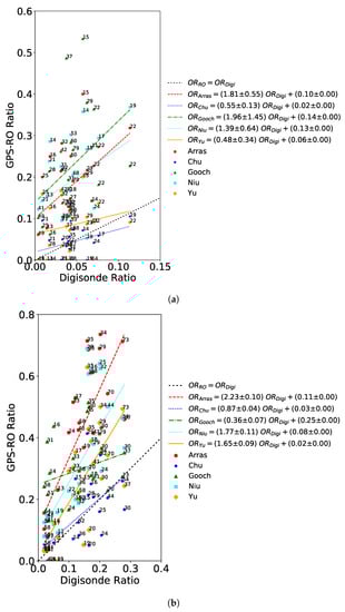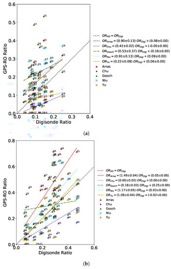 To maximize the number of data points, ORs were not separated by time of day (TOD) and the values provided here correspond to all-day averages. A quality control check was placed on the data using the technique outlined in Ref. [34], which places an upper limit of 1.5 on the mean deviation of the electron density (or here, TEC) profile. GPS-RO profiles with few data points (less than 400 for the 50 Hz data) were also excluded from the analysis. Ionosonde sites were required to have >4320 ionograms for the season of interest in a given year to be included in the comparison. This corresponds to ionosonde operation roughly half of the season assuming a 15 min ionogram cadence [14]. The seasonal results throughout 2010–2017 are combined to perform the statistical comparison between GPS-RO and ionosonde derived ORs. A lower limit of 10 observations was placed on the GPS-RO data at each site to be included in the combined data set for seasonal comparisons. Temporal gaps in ionosonde operations combined with quality control checks of the GPS-RO data [34] create a variable number of sites with an amount of GPS-RO observations greater than 10 (which is the lower limit for which the comparison is made) in the different seasons (i.e., summer and winter as discussed below).