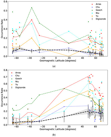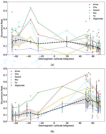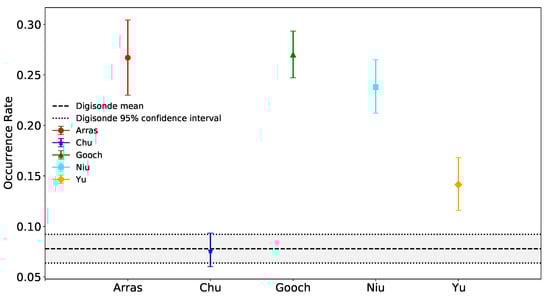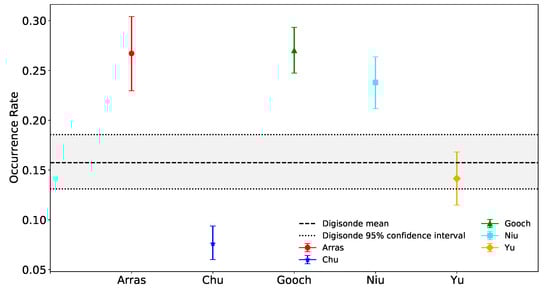 For the total occurrence rates with no lower limit on intensity, the Yu technique showed the closest agreement with ionosonde rates. In general, the Arras, Gooch, and Niu methods overestimated the occurrence rates for this intensity, while the Chu method underestimated rates. However, it must be noted that most techniques showed large variations in rates and no technique perfectly aligned with the ionosonde results over all locations and seasons. Occurrence rates calculated for fbEs MHz showed a strong agreement between the Chu technique and the ionosonde-derived rates. The other techniques overestimated the occurrence rates for this intensity threshold, in general.