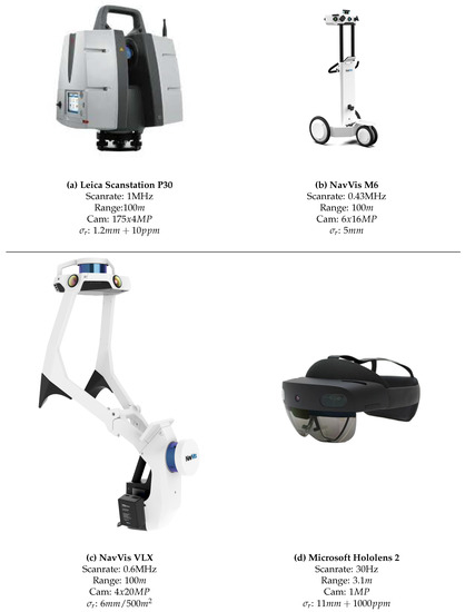 A recent addition to capturing devices are Mixed Reality systems (Figure 2d). These portable data acquisition solutions can be considered iMMs but do not have the same large-scale mapping capabilities. They are part of this study’s scope, as these systems will play a major role in digital built environment interaction which inherently includes mapping. They operate with 6 DoF SLAM but can only be deployed for smaller scenes due to poor field-of-view, range, and low-end sensor specifications. Single-point accuracies of 1 cm/m for the Lidar sensors are not unusual with a high error propagation, restricting them to close-range applications (LOA10–LOA20). Specifically for the Hololens 2, the spacial mapping is designed to run as a background task, using minimal resources to keep the device performant. Being a head-mounted device, the mobility leaves no restrictions for the user. The capabilities are focused on real-time mapping and less on accuracy. This results in on-device-computed meshes that can be used directly in the processing. These are generally lower in resolution so they can be stored on the device, but are also usable for mapping. However, the restricted range of only circa 3–4 m is a significant downside for BIM modeling/evaluation.