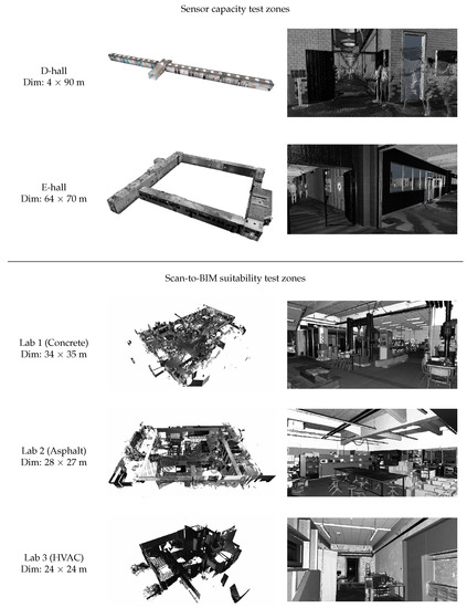 The experiments are conducted in different areas of our university technology campus in Ghent, Belgium. In total, five test zones are developed for the sensor capacity and point cloud suitability tests (Figure 4).