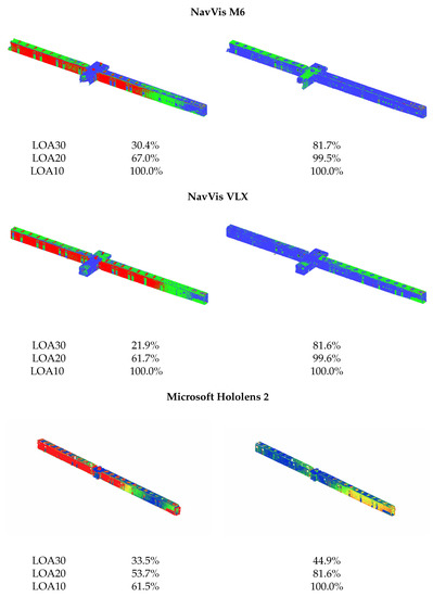 Finally, the Hololens 2 and other head-worn or hand-held devices offer a low-cost alternative to the above high-end systems. Their coverage rivals that of backpack-based systems, although the range is restrictive. Additionally, despite their low data quality, their semantic segmentation is surprisingly good. As such, these systems are capable of LOD200 modeling/analyses up to LOA10 and even LOA20 if properly supported by control measurements or in small areas. Currently, the spatial resolution and the accuracy are the main obstacles to reliably produce LOD300–350 of exact beam/column profiles, accurate wall thickness, etc. Furthermore, the speed is surprisingly low (3× slower than high-end mobile mappers) due to the limited field of view and range that both result in much longer pathing. Overall, these systems are best suited to be used on conjunction with other mapping systems that also provide proper alignment, i.e., standalone TLS or iMMs plus TS.