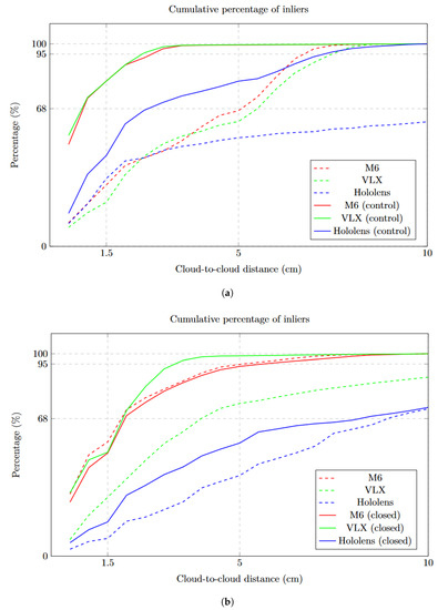 As discussed in Section 5, accumulative drift along the repetitive hallway is expected. Figure 5 reports the visual deviations and the inliers for each LOA bracket for the D-hall with and without the support of a control network. Figure 6a shows the percentual inliers with respect to m, conform common industry tolerances. Overall, the VLX and M6 iMMs maximum deviations fall within the threshold, showing less than 0.01 mm/10 m drift without control which is in line with the NavVis reports [51]. As expected, the low-end Hololens 2 reports much higher drift, with a maximum of 0.86 m deviation at 90 m. With the inclusion of control, the LOA30, 20, and 10 inliers for the M6 and the VLX, respectively, improve by 44.8% and 48.5%, while for the Hololens 2 this is only 21%. This is mainly caused by the poor close-range data quality of the Hololens 2, which prevents it from achieving LOA20 or 30 even without drift accumulation.