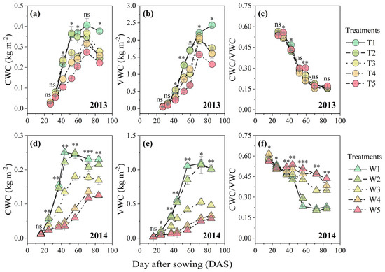 Progressive soil drying significantly decreased CWC and VWC based on RM-ANOVA (Figure 1). The dynamic characteristics of CWC and VWC shared a similar trend of first increasing and then decreasing in both growing seasons (Figure 1a,b,d,e). The CWC and VWC values of the T1–T5 treatments concurrently reached maximum values at 70 DAS. In contrast, the date when CWC and VWC approached their maximum values was delayed with the irrigation reduction for the W1–W5 treatments in the 2014 growing season. In addition, the ratio of CWC to VWC exhibited a decreasing trend, and the difference among the T1–T5 treatments in 2013 was less than that among the W1–W5 treatments in 2014 (Figure 1c,f).
