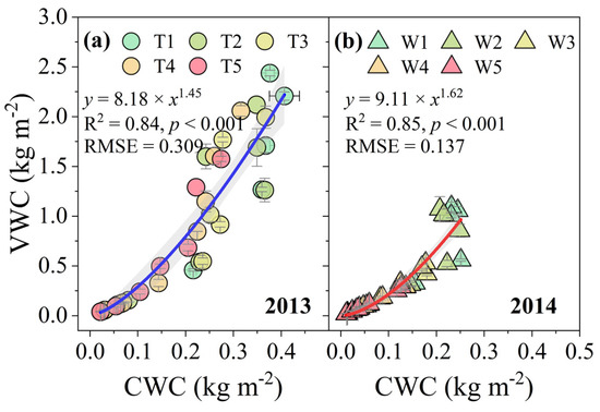 Connection between canopy water content (CWC) and vegetation water content (VWC) during soil drying under different irrigation treatments in the 2013 (a) and 2014 (b) growing seasons. Nonlinear regression lines show the 95% confidence intervals. Error bars denote mean ± SE.