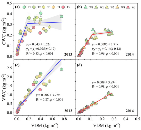 Relationship between canopy water content (CWC), vegetation water content (VWC), and vegetation dry mass (VDM) during soil drying under different irrigation treatments in the 2013 (a,c) and 2014 (b,d) growing seasons. Linear and nonlinear regression lines show the 95% confidence intervals. Error bars represent mean ± SE.