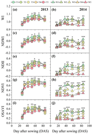 Temporal variability in vegetation indices (WI, NDWI, NDII, NDVI, and OSAVI) during soil drying among different irrigation treatments in the 2013 (a,c,e,g,i) and 2014 (b,d,f,h,j) growing seasons. WI, water index; NDWI, normalized difference water index; NDII, normalized difference infrared index; NDVI, normalized difference vegetation index; and OSAVI, optimal soil-adjusted vegetation index. The “***”, “**”, and “*” denote significant differences among treatments based on the analysis of variance (ANOVA) at p < 0.001, p < 0.01, and p < 0.05 levels, respectively, while “ns” indicates no significant differences. Error bars denote mean ± SE.