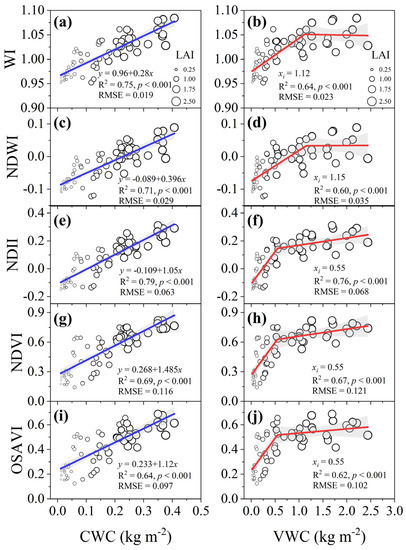Moreover, the critical values where the SVIs responded to VWC were 1.12 kg m−2 and 1.15 kg m−2 for the WI and NDWI (Figure 5b,d), respectively, while the NDII, NDVI, and OSAVI had the same critical value of 0.55 kg m−2 (Figure 5f,h,j). The NDII, NDVI, and OSAVI tended to be easier to saturate at low LAI values than the WI and NDWI, as indicated by the LAI to some degree. The results indicated that, in comparison to the NDVI and OSAVI, the WI, NDWI, and NDII were better able to capture CWC variations during soil drying. However, all five SVIs captured the VWC variations before a threshold value of VWC, but they did not sensitively reflect the VWC variations after that point, as the values of the SVIs did not increase significantly with the increase in VWC (Figure 5b,d,f,h,j).