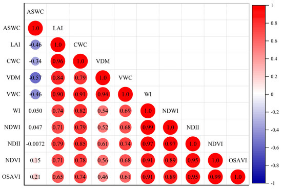 A visualization of Pearson correlation matrix of canopy characteristics and the spectral vegetation indices. ASWC, available soil water content; LAI, leaf area index; CWC, canopy water content; VDM, vegetation dry mass; VWC, vegetation water content; WI, water index; NDWI, normalized difference water index; NDII, normalized difference infrared index; NDVI, normalized difference vegetation index; and OSAVI, optimal soil-adjusted vegetation index.