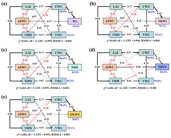 Moreover, SEM analysis revealed that the combination of these direct and indirect effects via the five key variables accounted for 79.3%, 74.1%, 81.8%, 82.2%, and 78.8% of the variances in WI, NDWI, NDII, NDVI, and OSAVI, respectively (Figure 7). The dynamics of the WI, NDWI, NDII, and OSAVI were directly regulated by CWC and ASWC, and indirectly modulated by LAI, VWC, and ASWC (Figure 7a–c,e). In contrast, the NDVI was directly influenced by CWC, ASWC, and VDM but was indirectly controlled by LAI and VWC (Figure 7d).