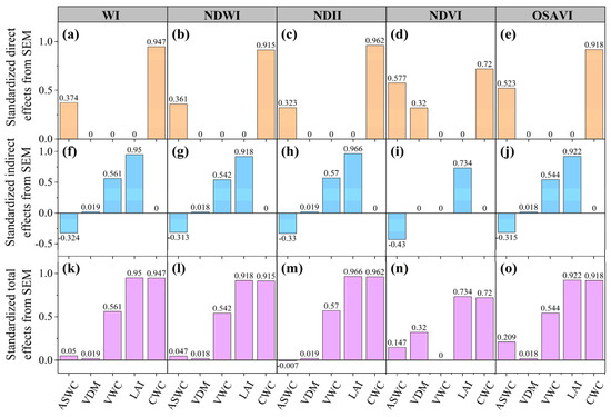 Standardized direct (a–e), indirect (f–j), and total effects (k–o) on the spectral vegetation indices derived from the structural equation model (SEM). ASWC, available soil water content; LAI, leaf area index; CWC, canopy water content; VDM, vegetation dry mass; VWC, vegetation water content; WI, water index; NDWI, normalized difference water index; NDII, normalized difference infrared index; NDVI, normalized difference vegetation index; and OSAVI, optimal soil-adjusted vegetation index.