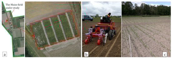 All experiments and data collections were carried out between June and September of 2019, on a maize field at the Marquardt Digital Agriculture field of the Leibniz Institute for Agricultural Engineering and Bioeconomy, located in Potsdam, Germany (Lat: 52°28′01.2″N Lon: 12°57′20.9″E, Alt: 65–68 m). A map of the area is shown in Figure 3a. The landscape of the field was dominated by small-sized experimental plots containing other crops. The distribution of the maize field with 3 sub-plots is shown in Figure 3a. The study characterized three cultivars of maize with different canopy architectures that were cultivated in 12 plots over a total area of 48 by 36 m2. The maize field was seeded on 3 May 2019, with two rows per bed using a precision seeder (Terradonis company, La Jarrie, France) that was attached to a HEGE 76 farm-implement carrier (HEGE Maschinen, Hohebuch, Germany), as shown in Figure 3b. The seeder had two independent seeding units that were mounted on a bar and were then adjusted for a row spacing of 0.75 m spacing. The disk system was used to set a plant spacing of 0.25 m. The seed rate was equal through the experimental plots. Cultivation practices including irrigation, nutrition, fertilizer, and pesticide applications were performed by expert technicians. Figure 3c shows a view of the field at 26 days after sowing (DAS). Maize reached the growth stage of 13–15 on the Biologische Bundesanstalt, Bundessortenamt und CHemische Industrie (BBCH) scale code [].