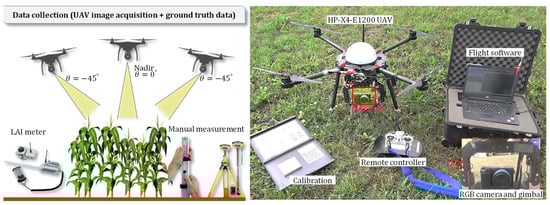 Illustration of the UAV-based image acquisition and manual ground truth measurements. The 2-axis gimbal was used to mount the camera sensor at −45° and nadir angles.