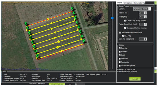 Measurements of LAI and plants’ height were performed on the same day of the UAV flight campaigns. A screenshot of the map of the actual flight route and the flight control adjustments are shown in Figure 5. LAI was measured by a SunScan plant canopy analyzer system (SS1-COM-R4, Peak Design Ltd., Winster, UK). The analyzer system included a BF5 Sunshine Sensor, RadioLink components, a Personal Digital Assistant (PDA), a SunScan probe, and a tripod (shown earlier in Figure 4). The BF5 Sunshine Sensor was linked with the RadioLink component and then leveled by the three-axis tripod to record the above-canopy reference. The Handheld PDA is connected to the SunScan probe to collect and analyze readings from measurements. The system was used to measure the averaged LAI in sample areas for the canopy of different maize cultivars and growth variability. The plant height (PHT) and yield data were also collected according to agronomic reference measurements. Ground control points were designed to place in the field. They later were determined using the differential GPS HiPer Pro system (Topcon Corporation, Tokyo, Japan), having a relative horizontal and vertical accuracy of 3 and 5 mm (shown in Figure 5). It should be mentioned that the measurements did not involve any destructive sampling to record the lengths or the widths of the plants and leaves. In this study, the manually measured LAI and plant heights are referred to as actual measurements, while those extracted from UAV images are the estimated measurements.