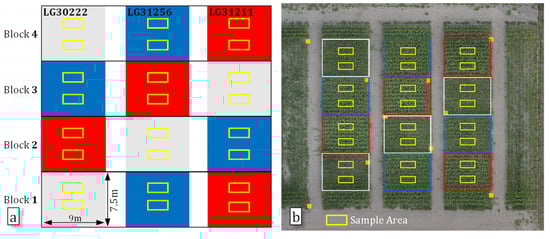 Illustration of the randomized complete block design, showing (a) the schematic view and (b) the actual view for a layout of one factor (maize) with three treatments for contrasting canopy architectures. The field was split into four blocks. The gray, blue, and red colors of blocks refer to cultivar LG30222, LG31256, and LG31211.