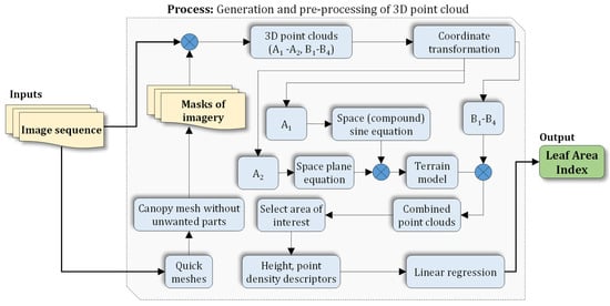 UAV images were processed using Agisoft Metashape Professional 1.7.3 (Agisoft LLC, St. Petersburg, Russia). The software uses SfM photogrammetry for generating 3D point clouds. For each growth stage, a 3D point cloud was generated from the nadir and oblique view set of images. The pre-processing steps included manual removal of invalid images (i.e., images that were acquired at the very beginning and end of the flight campaign, or those that were taken outside the field). The valid images from the six flight campaigns (A1–A2, B1–B4) were then imported to the Metashape, resulting in six individual image sequences which were processed individually by the software. For each image, maize canopy were separated from the soil and other undesired objects before modeling. This mask was created by the standard workflow for generating a quick mesh in Metashape. This step was required to improve the canopy model. Because most of the matching point pairs were extracted from irrelevant soil background, it reduced the usage of matching point pairs within the plant canopy. Prior to the image alignment, the mask was imported with the following software settings: method: from model, operation: replacement, and tolerance: 10. This approach avoided repetitive creation of masks for each individual image. The masks were then applied while generating the 3D point clouds using the SfM approach, including alignment, GCP labeling, gradual selection, and optimization procedure. Figure 7 illustrated the process of the generation of LAI from 3D point clouds using UAV RGB imagery. Here, the image sequences were used to create masks before 3D modeling and then the extracted masks of imagery were applied to generate the 3D point clouds (A1–A2, B1–B4). The point clouds were transformed to local coordinates. In the next step, the 3D point clouds A1–A2 were used for the derivation of the terrain model using a space (compound) sine equation and a space plane equation for the base-plane model, and the simulated micro-terrain. The terrain model was then merged with the 3D point clouds B1–B4 to obtain combined point clouds. The height, point density descriptors were calculated from the selected area of interest from the combined point clouds. The LAI were then calculated through a multivariate linear regression using height and point density descriptors in the select area of interest.