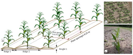 where c is a constant to adjust the height difference caused by tillage. Henceforth, only the simulated terrain model was used, and thus its explicit dependence on the ground surface point cloud was omitted. A schematic and two actual views of the ground surface are provided in Figure 8, showing ridges, row spacing and plant spacing of the ground surface (Figure 8a), and the nadir and side view of the actual field (Figure 8b,c).