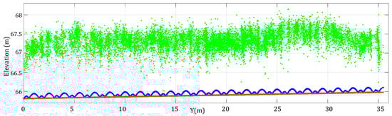 The terrain model was derived using a compound equation of two sine functions to simulate a curved surface that was constrained to point cloud (early growth stage) with additional information of point cloud (after tillage) for the base plane parameters. In the field, there is a periodic nature in the terrain present due to ridges and furrows that changes in the row direction. The difference of the peaks in a period is due to the rollers of field vehicles. To obtain the characteristics of this periodicity, soil points were extracted from . The soil point section was then projected on the YZ-plane, and its characteristics were obtained through preliminary observations of the lower limit of the section, which has two-dimensionality and periodicity. These characteristics were used for defining the parameters A and B in Equation (7). Equation (7) describes the curve that characterizes this micro-terrain pattern by using a combined periodic piecewise sine function: