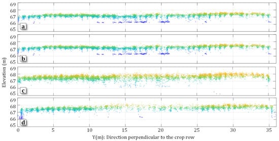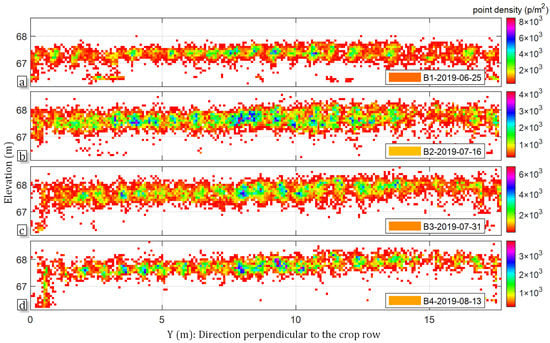 The following steps were used to estimate the canopy height from the point clouds. First, the middle part of the point clouds were extracted, which covered an area of 1 by 36 m along the middle line of superplot . It should be noted that the point clouds of the sample areas were included in the extraction. This resulted in three selections of points extracted from four point clouds with respect to the corresponding superplots () and growth stages (s). The sample selection of the points in is given by Equation (10):