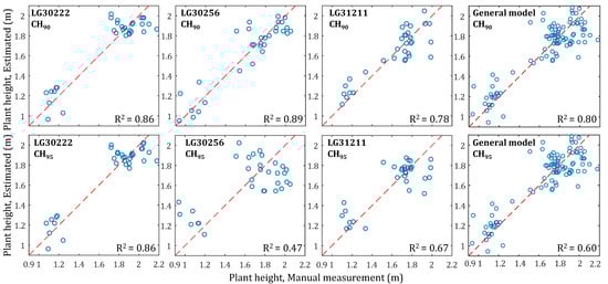 - Except for the datasets corresponding to LG30256-CH95 (R2 = 0.46) and LG31211-CH95 (R2 = 0.67), the height estimation of maize achieved a relatively high correlation (R2 = 0.89, 0.86, 0.78) for cultivar datasets LG30222-CH90, LG31256-CH90, and LG31211-CH90 between the estimated and actual data, indicating effective modeling by point cloud data. Additionally, a general model for height estimation was derived for all three cultivar datasets with an R2 of 0.80 in CH90. This could be beneficial to breeding experiments.