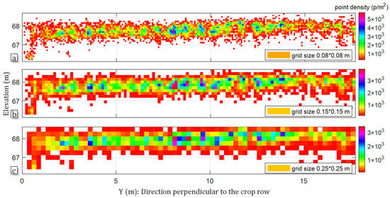 where is the number of points measured in per grid, and are the number of grids in Y-axis and height directions, and are the boundary values of the point cloud, is the density grid size. The matrices with different grid sizes are represented as , , and . The second step was to obtain a descriptor for the canopy density to describe the distribution for each sample area. For this purpose, a ratio was calculated between the amount of grid greater than and the total map grid. The selected value of was . Here, relates to the average point cloud density of the 2D canopy map obtained by dividing the total number of points by the area of the valid grids. Grid cells, where the density fall below the threshold , were not used in the calculation of the descriptors. (Figure 14). Equation (14) refers to the descriptors for the sample areas in :