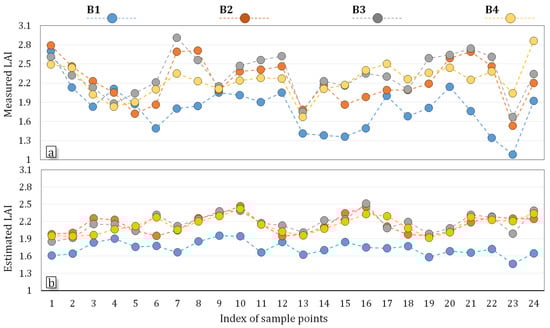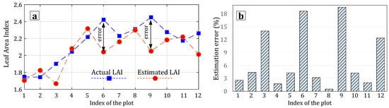 Actual and estimated LAI for each plot (a), and percentage of the estimation error (b).