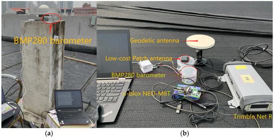In the experiment, the reference station included a high-precision geodetic GNSS receiver Trimble NET R9, a Trimble Choking 59,800 antenna, and a low-cost BMP280 barometer. The mobile station consisted of a single-frequency low-cost u-blox receiver NEO-M8T, a patch antenna, and two BMP280 barometers. The mobile station was also equipped with a geodetic receiver Trimble NET R9 for data acquisition, and the postprocessed kinematic (PPK) mode of commercial software Inertial Explorer 8.70 was used to process data to obtain high-precision 3D coordinate sequences as reference values. The nominal resolution of the low-cost BMP280 barometer was 0.01 mbar (0.1 m) and the data sampling rate was set at 1 Hz. As shown in Figure 2, to prevent the effect of crosswind on the barometric pressure, the barometer was placed inside a transparent plastic box with several small holes at the top of the box. All experimental data were recorded and postprocessed by a laptop computer. The height deviation of the BMP280 barometer from the GNSS antenna phase center was compensated by data preprocessing, and the DGNSS/DBA combined positioning analysis was performed by the self-written programs.