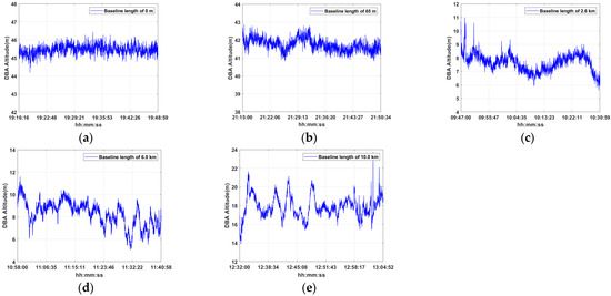 Time series of the DBA altitude results for five mobile station locations at different baseline lengths: (a) 0 m; (b) 65 m; (c) 2.6 km; (d) 6.0 km; (e) 10.0 km.