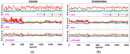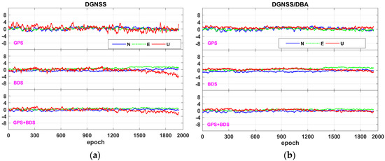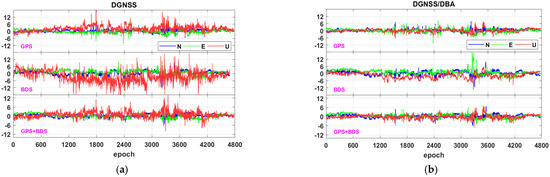 The deviation sequence diagram in the N/E/U directions during the kinematic vehicle experiment in the open urban environment: (a) DGNSS positioning mode; (b) DGNSS/DBA positioning mode.