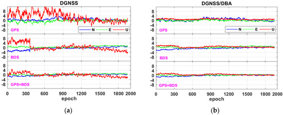 The deviation sequence diagram in the N/E/U directions at 10−degree elevation mask angles: (a) DGNSS positioning mode; (b) DGNSS/DBA positioning mode.