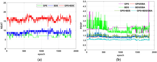Observation values of kinematic vehicle experiment in the open urban environment: (a) the number of GNSS visible satellites; (b) the sequence of PDOP values.