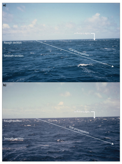 There are numerous visual observations, in particular from ships, that ISWs are associated with bands of choppy waters containing surface breaking waves. An early description of this phenomenon can be found in the book of Maury [12], which is quoted in Osborne and Burch [13]. This book contains reports about roughness bands or ripplings, which are often observed from ships in the Andaman Sea: “The ripplings are seen in calm weather approaching from a distance, and in the night their noise is heard a considerable time before they come near. They beat against the sides of a ship with great violence, and pass on, the spray sometimes coming on deck; and a small boat could not always resist the turbulence”. “The ripplings consist of broken water, which makes a great noise when the ship is passing through the ripplings in the night”. At that time, it was not known that the roughness bands are sea surface manifestations of ISWs. However, Perry and Schimke [14], who made oceanographic surveys in the Andaman Sea north of Sumatra from a ship in 1964, identified the roughness bands or “rips” as sea surface signatures of “large-amplitude internal waves”. They observed roughness bands, which ranged from 200 to 800 m in width, stretched from horizon to horizon (approximately 30 km), and had a spacing of about 3200 m between the bands. The bands of choppy water contained short, steep, randomly oriented waves with heights of about 0.3 to 0.6 m. Each band stood out distinctly in an otherwise undisturbed sea (wind speed: 4 m/s). Moreover, Osborne and Burch [13] observed roughness bands in the Andaman Sea during a campaign, which was designed to measure internal waves and the associated response of a drillship simultaneously, and attributed them to sea surface manifestations of ISWs. On one occasion, they observed six distinct roughness bands, each approximately 600 to 1200 m wide, with breaking waves about 1.8 m high. After the passage of the roughness band, the wave heights quickly decreased in wave height to less than 0.1 m, and the sea surface had the appearance of a “millpond”. The entire process repeated at approximately 40 min intervals.