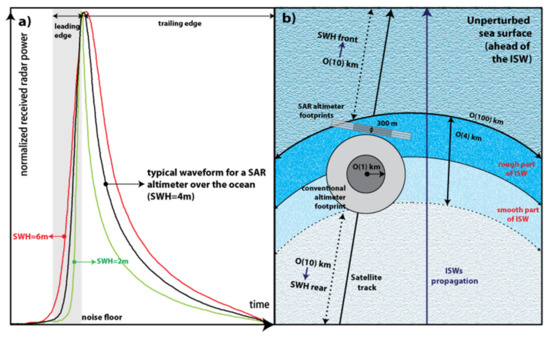 The morphology of SAR waveforms is also significantly altered in the presence of ISWs—including SWH estimates, since the leading slopes (in SAR waveforms) feature a variable steepness between the internal waves’ leading and trailing sections (see Figure 3 and Figure 4 in [8]). This feature is relevant in the framework of this paper because SAR waveforms are sensitive to SWH along an ISW section (crest and trough), and appear to be sensitive to enhanced surface waves within a given signature of ISWs. Hence, re-tracked geophysical parameters such as σ0 or SWH are suited to investigate possible contributions in the altimetry echoes resulting from enhanced surface wave breaking.