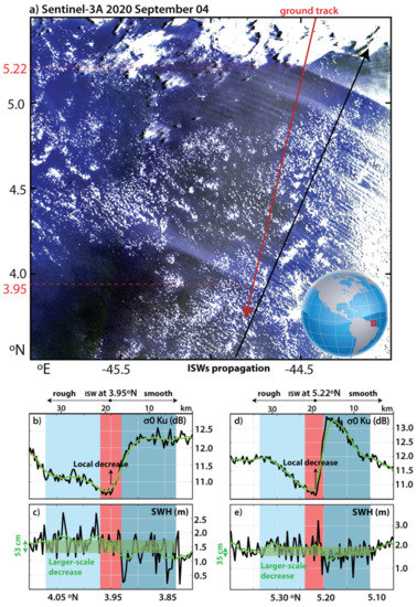 SWH along-track profiles are examined in this paper at two different scales. First, an algorithm (described in [9]) is used to locate the approximate center of the ISWs, which is depicted at the location of the largest gradients of the SWH signal, usually at the transition between a local maximum and the immediately following local minimum. The algorithm first detects the ISW in σ0, and in this work we perform the identification of the ISW center manually, i.e., based on our best interpretation of the SWH signal. Secondly, we consider the ISW as the feature ±0.02° of latitude to each side of the ISW center. This represents approximately ±2 km in the along-track direction to each side of the ISW center, hence corresponding to an approximate wavelength of 4 km (note that in this paper we select ISW fronts perpendicular to the satellite tracks). This wavelength is consistent with the altimeter profiles we show and analyze in Section 3, being also the average wavelength reported in Magalhaes et al. [40], who used SAR images to study ISWs off the Amazon shelf. An illustration of this “small-scale” region is shown in Figure 4b,c in red shaded rectangles.