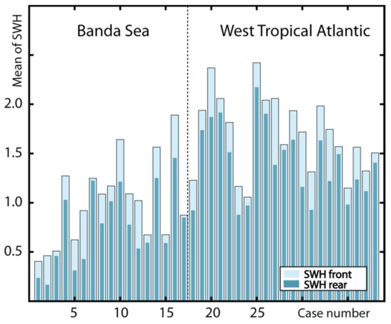 We now present in Table 1 results of the SWH average cross-sections of ISWs observed (simultaneously) in OLCI acquisitions and in σ0. We used 38 examples in total, from 23 different dates (i.e., sometimes more than one ISW was accounted on the same date), being 10 in the Banda Sea and 13 in the Tropical West Atlantic. To calculate the SWH average cross-sections of ISWs, we used the average value within ±10 km before and after the ISWs’ center regions (depicted in light red shades in Figure 4b–e, which are about 4 km in length), which we named SWH rear and SWH front, respectively. Please see Section 2.2.4 for more details.